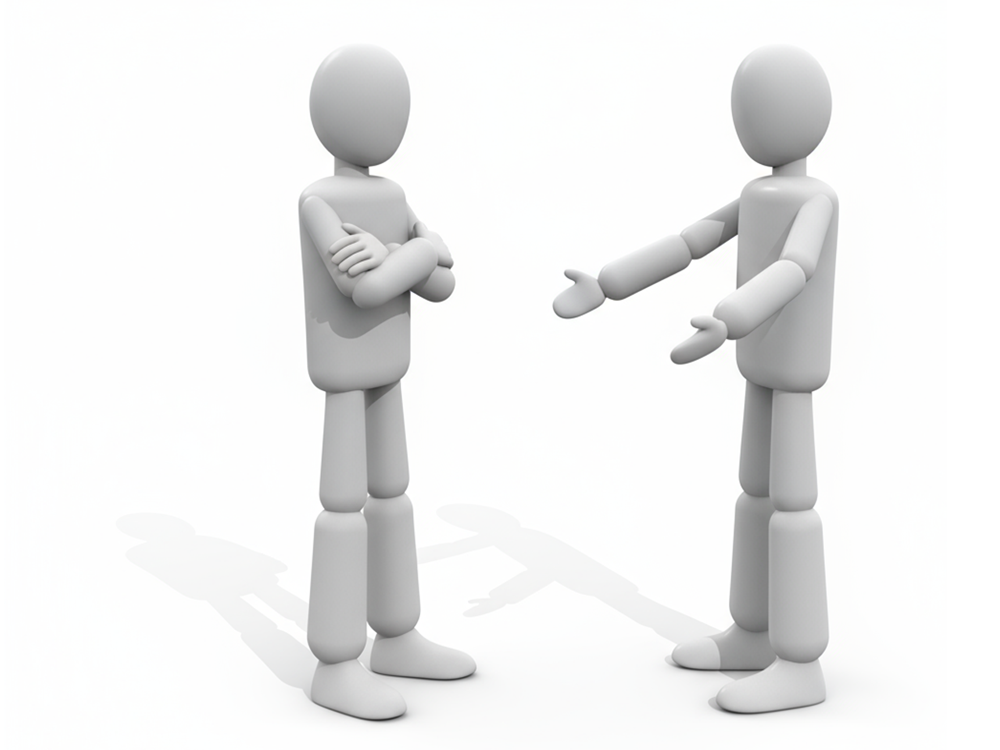 二人の人物が向かい合って立っているイラストです。一人は腕を組んで話を聞くような姿勢(傾聴・受け止め)、もう一人は両手を広げて何かを説明(対話・提案)しているポーズです。この構図は、「コミュニケーション」「相談」「意見交換」「人間関係」「面談」「コーチング」といった、対話の状況を象徴的に表現するのに適しています。ビジネス、教育、カウンセリング、広報といった幅広いテーマのコンテンツに有効です。無料でダウンロードできるフリー素材で、ウェブサイト、研修資料、記事の挿絵など、商用利用を含め幅広くご利用いただけます。