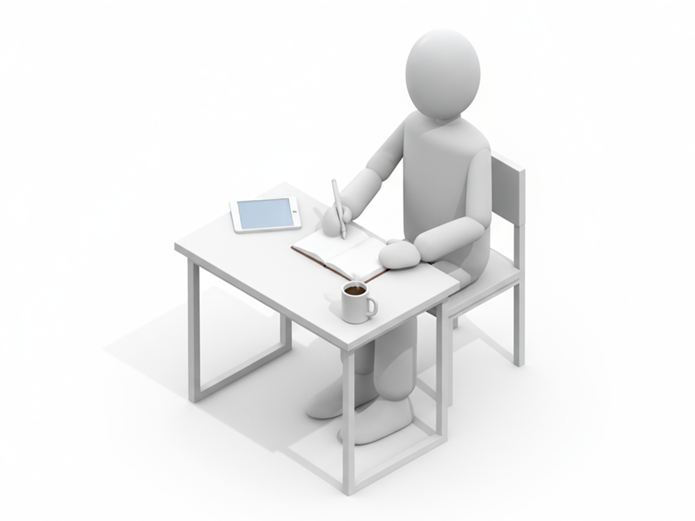 一人の人物が椅子に座り、デスクの上でノート(手帳)にペンで書き込みをしているイラストです。デスクにはタブレットとコーヒーが置かれており、現代的な仕事や学習の風景を表しています。アイデア出し、会議のメモ、集中、計画、執筆、リモートワークなど、様々な知的活動の状況を表現するのに適しています。ビジネス、教育、ライフハックのコンテンツ作成に特に有効です。無料でダウンロードできるフリー素材で、商用利用OKのため、ウェブサイト、プレゼン資料、記事の挿絵など、幅広くご利用いただけます。