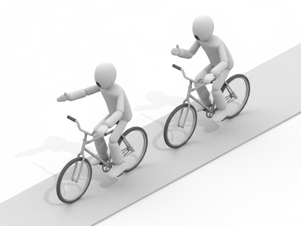 二人の人物が、上り坂を自転車で走行しているイラストです。一人は前方を指差し先導し、もう一人は後ろでサムズアップ(グッドサイン)をしており、健全な競争や目標に向かって共に進む様子を表しています。この構図は、ビジネスにおける競合他社との競争、進捗状況、モチベーション、仲間との切磋琢磨といった、意欲的で前向きな行動を表現するのに適しています。シンプルなデザインながらも、スピード感と高揚感が伝わります。この無料イラストは、商用利用OKのフリー素材として提供されているため、ビジネスの企画書、スポーツ関連の記事、教育資料など、多用途にご利用いただけます。