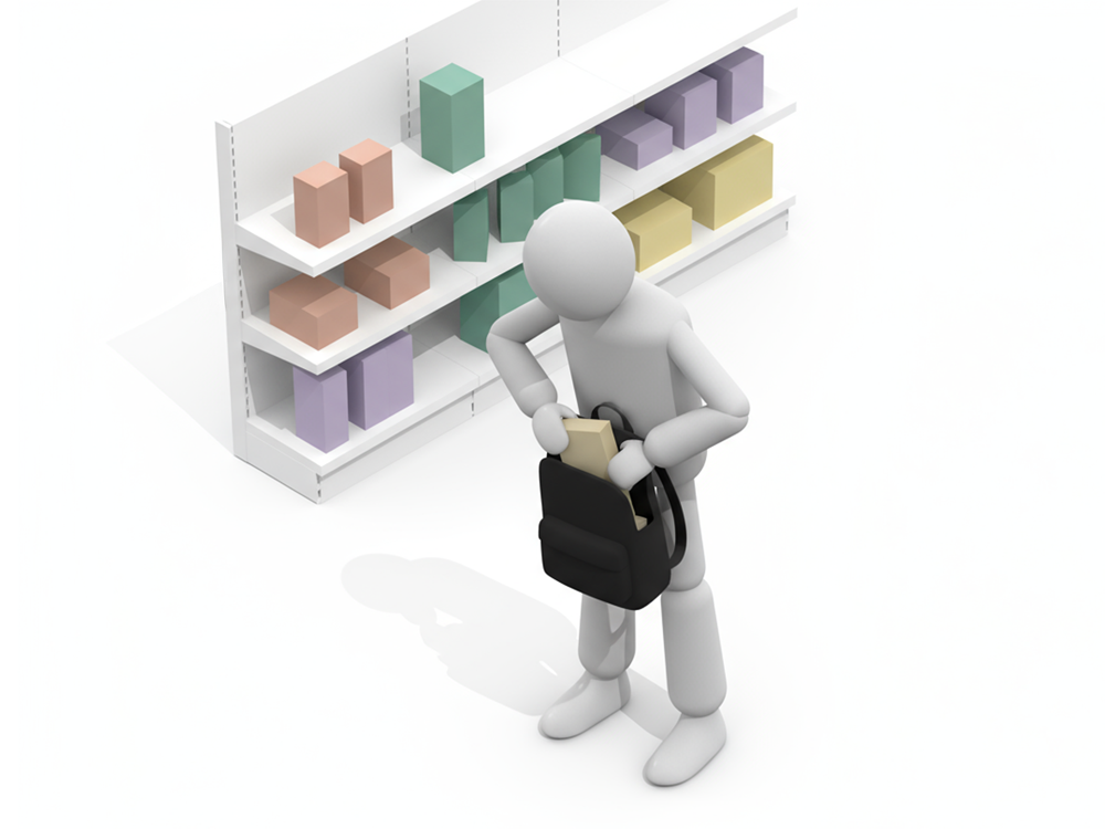 一人の人物が、陳列棚の前でかがみ込み、棚の商品と思われる箱をバッグ(リュックサック)の中に入れているイラストです。この行動は、「万引き」「窃盗」「不正行為」「犯罪」といった、防犯対策に関するテーマを象徴的に示しています。小売店の防犯マニュアル、セキュリティ関連の記事、法令遵守(コンプライアンス)の研修資料、学校での指導など、注意喚起や警告を促したい多様な場面で活躍します。シンプルながらも行為の性質が明確に伝わります。この無料イラスト・フリー素材は、商用利用OKで、安心してご利用いただけます。