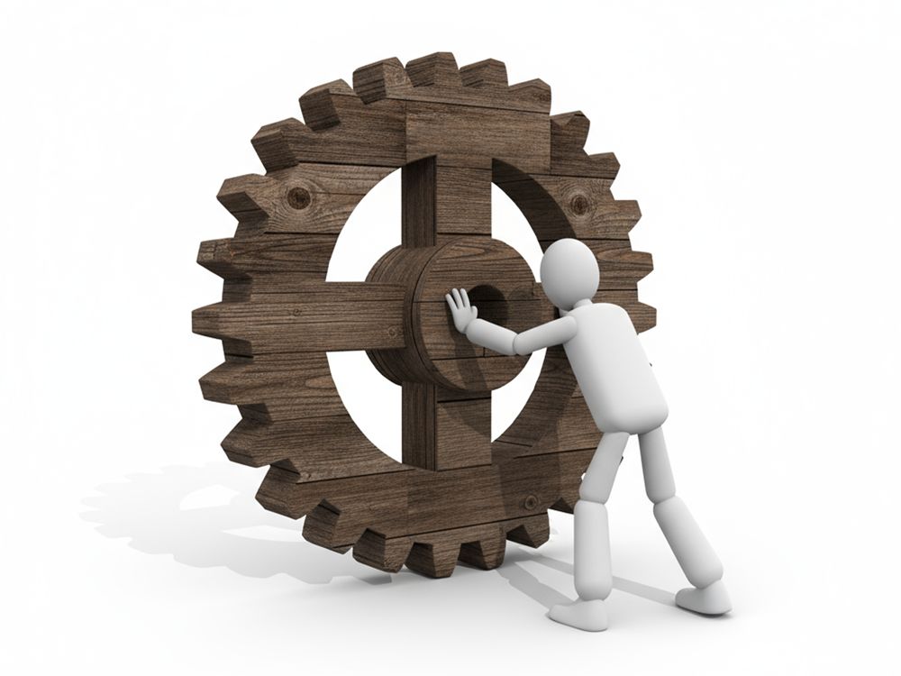 一人の人物が、木製の巨大な歯車を、全身を使って押して動かそうとしているイラストです。この動作は、「努力」「貢献」「システムの稼働」「業務の推進力」「大きな課題への挑戦」「地道な作業」といった、ビジネスや組織活動における様々な概念を象徴的に表現しています。組織論、マネジメント、業務改善、プロジェクト推進といったテーマのコンテンツに非常に有効です。立体的で力強さが伝わるデザインが特長です。この無料イラストは、商用利用OKのフリー素材として提供されているため、研修資料、企画書、ウェブサイトなど、多用途にご利用いただけます。