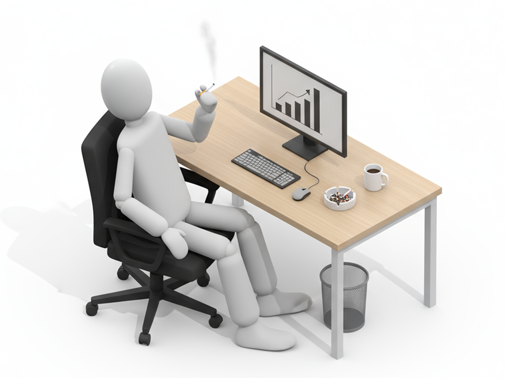 一人の人物がオフィスチェアに深く座り、パソコンの画面(グラフ表示)を見ながら、片手でタバコを吸っているイラストです。灰皿やコーヒーもデスクに置かれており、仕事中の喫煙習慣を示しています。このイラストは、喫煙と仕事の関係、休憩、職場での健康問題、集中力、リラックスといった多様な状況を表現するのに適しています。健康啓発、職場のルール、ストレス管理、禁煙の推奨といったテーマのコンテンツに特に有効です。シンプルな構図でメッセージが明確に伝わります。この無料イラスト・フリー素材は、商用利用OKで、安心してご利用いただけます。