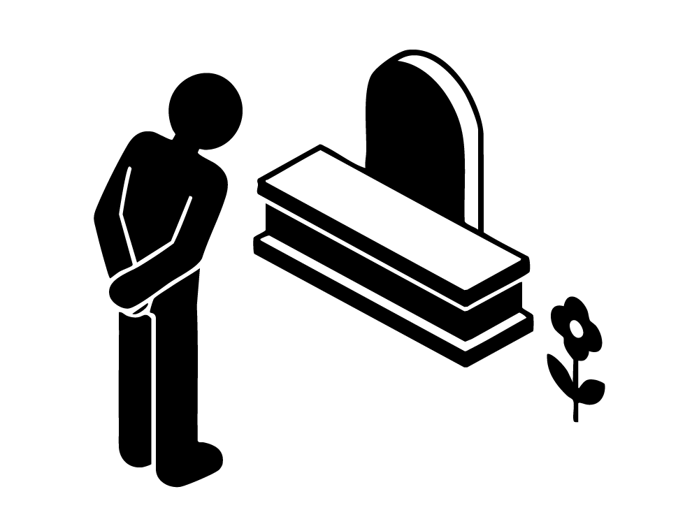 この無料イラストは、墓石と供えられた一輪の花の前に、深くお辞儀をして故人を追悼している人物を描いたピクトグラムです。この図は、お墓参りや供養といった弔意を表す行為、また人生の終わりとそれを受け入れる儀式を象徴しています。葬儀や終活(エンディングノート)、生命保険、仏事に関する情報、心の健康に関するブログ記事など、生と死や家族の絆といったテーマに寄り添うコンテンツに最適です。シンプルながら厳粛で敬意のある雰囲気を伝えるフリー素材です。