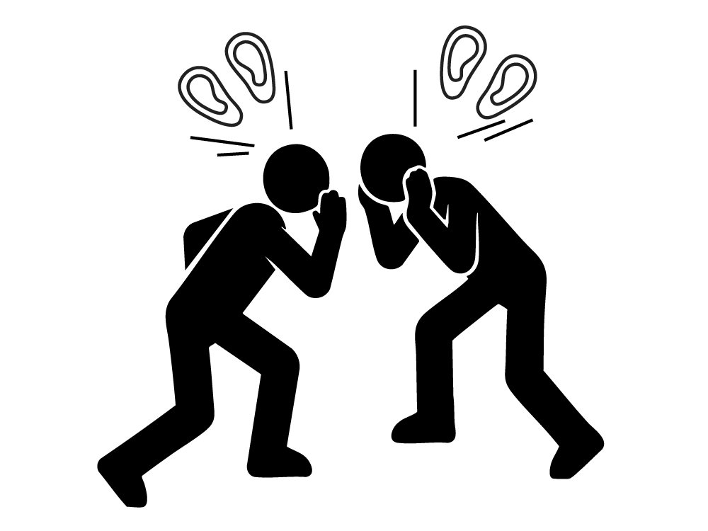 この無料イラストは、一人の人物がもう一人の人物の耳元に口を寄せ、秘密や陰口、あるいは悪意のある情報をささやいている様子を描いたピクトグラムです。過剰に大きく描かれた耳と、音波のような線は、聞かされている情報が不快であるか、あるいは大きな問題であることを示唆しています。これは、ハラスメント(言葉の暴力)、噂話による人間関係のトラブル、秘密の共有、情報操作といったテーマに活用できます。職場や学校でのコミュニケーションの問題を解説する際に、問題提起として最適なフリー素材です。