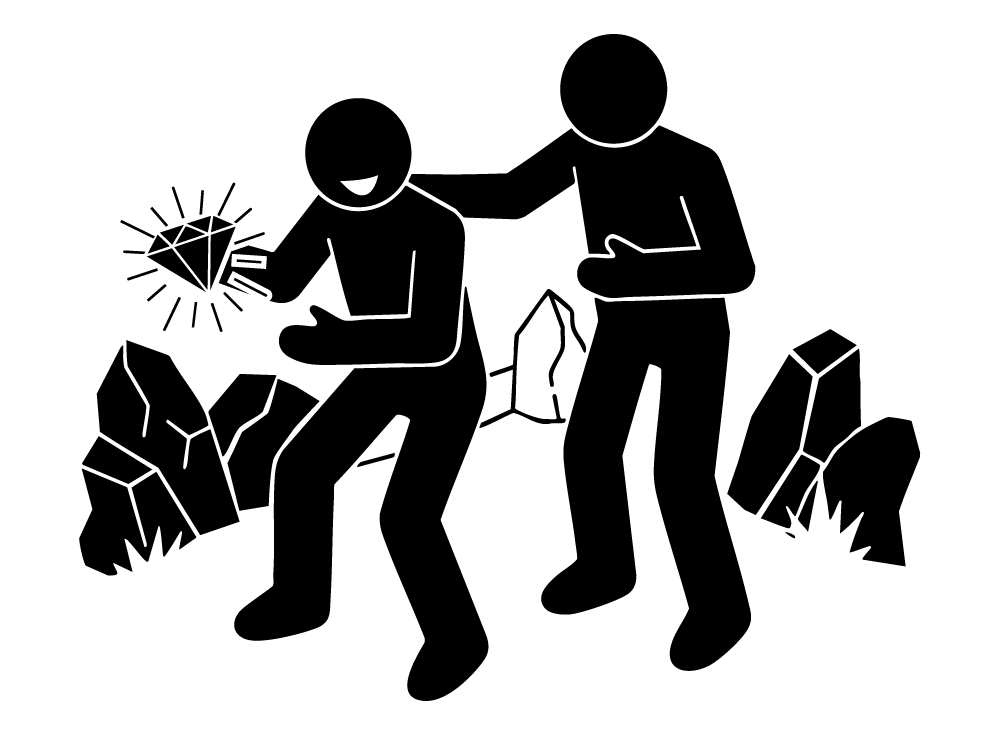 この無料イラストは、岩場のような困難な場所で、一人の人物が輝くダイヤ(宝物)を発見し、笑顔でそれを掲げている様子を描いたピクトグラムです。もう一人の人物が肩に手を添えていることから、成功へのサポートや導きがあったことも示唆されます。この図は、努力の末の発見、ビジネスにおける大きな成果やチャンス、価値あるものの獲得を象徴しています。投資の成功、市場での優位性、アイデアの発見といったポジティブなテーマに最適なフリー素材です。