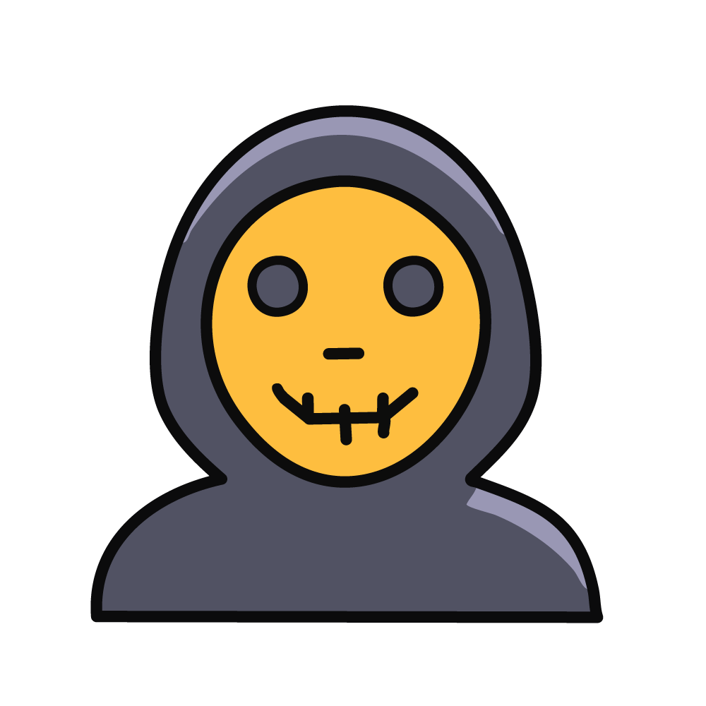 黒いフードを深くかぶり、オレンジ色の顔と大きな目、口元に縫い目が入った顔のアイコン風イラストです。ミステリアスな表情は、ハロウィンやホラー・サスペンス系のコンテンツのダークなテーマにぴったりです。ゾンビ、死神、ミイラなどを連想させるデザインで、他のハロウィンキャラクターと組み合わせることで、より深い物語性を生み出せます。商用利用OKのフリーイラストなので、イベント告知、ブログ挿絵など、様々なデザインに自由にお使いください。