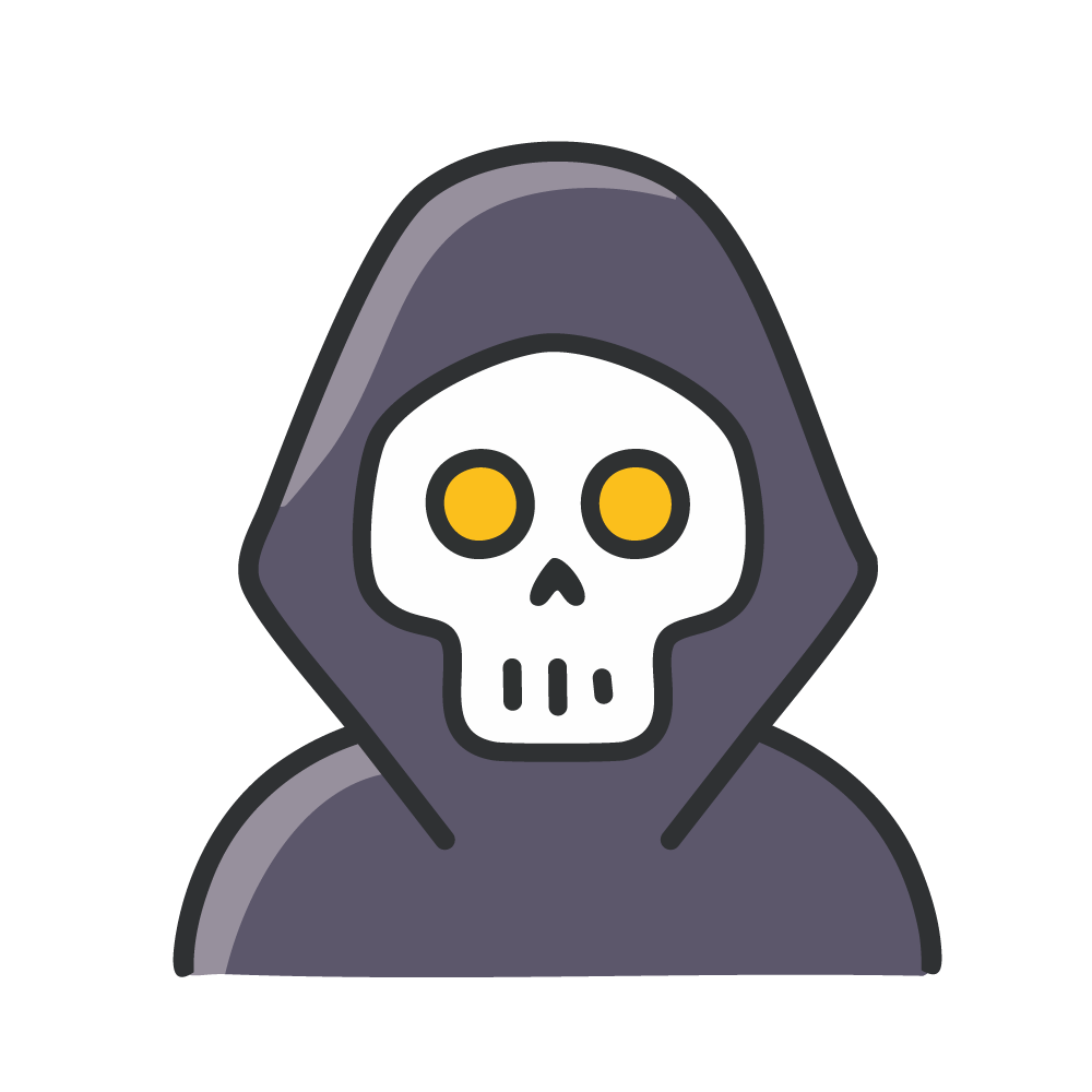 深い黒色のフードから、白い骸骨(ドクロ)の顔を覗かせたアイコン風イラストです。黄色い瞳がアクセントとなり、死神や怪しい魔術師のような雰囲気を醸し出しています。ハロウィンのダークな要素やホラー要素を象徴するデザインで、大人向けのハロウィンコンテンツやミステリー・ホラー系のウェブサイトに理想的です。商用利用OKのフリーイラストなので、商用デザインに自由にご利用ください。