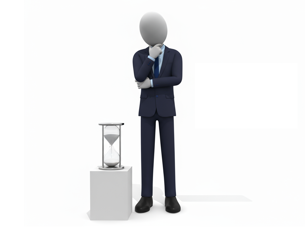 スーツを着たビジネスパーソンが、残り少なくなった砂時計の横で腕を組み、顎に手を当てて深く考え込んでいる様子のイラストです。この人物イラストは、時間管理(タイムマネジメント)の重要性、迫りくる締め切り(デッドライン)、限られた時間内での重要な意思決定、機会損失のリスクといった、時間に関する様々なビジネスシーンを表現するのに適しています。プロジェクトの進捗管理に関する資料、効率的な働き方を提案するコラム、期間限定キャンペーンの告知などで効果的に使用できます。シンプルな構図でメッセージが伝わりやすい、汎用性の高い無料イラストです。商用利用可能なフリー素材として、様々な場面でお役立てください。