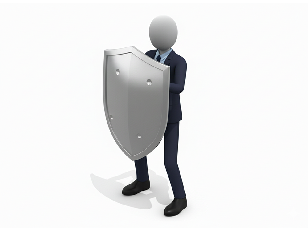 スーツを着用したビジネスパーソンが、頑丈そうな金属製の盾を両手でしっかりと構え、あらゆる脅威から身を守ろうとしている姿を描いたイラストです。この人物イラストは、サイバーセキュリティ、情報漏洩対策、リスクマネジメント、コンプライアンス遵守、保険による保障など、「防御」や「保護」に関連するあらゆるテーマを表現するのに最適です。企業のセキュリティポリシーを説明する資料や、個人情報保護の重要性を訴えるWebページ、信頼性が求められる金融サービスや保険商品の案内などで幅広く活用できます。無料でダウンロードできるフリー素材として、企業の信頼性や安全性を視覚的にアピールするのに役立ちます。商用利用も可能です。