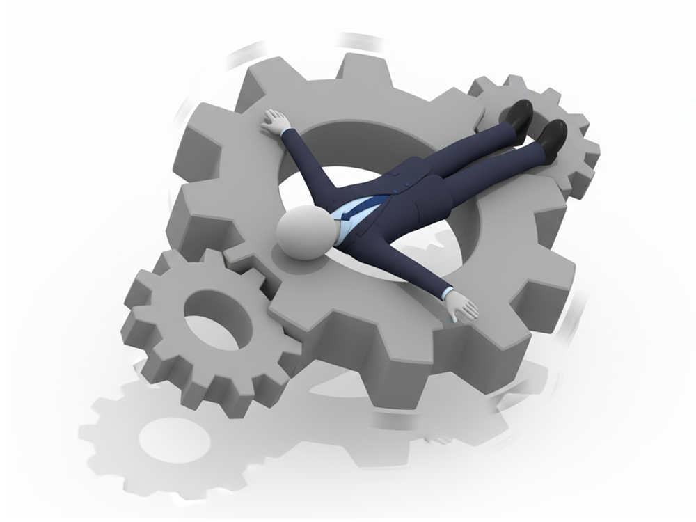 システムの歯車と疲労|歯車の上で力尽きた人物の無料イラスト