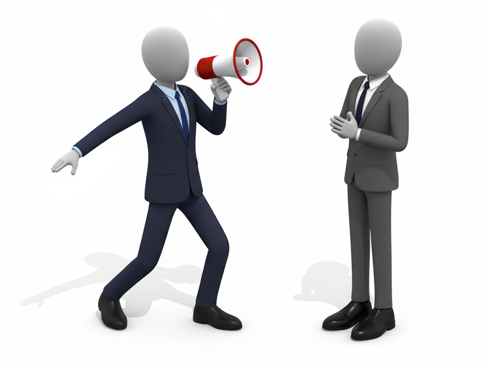 スーツ姿のビジネスパーソンが、メガホンを使って同僚らしき人物に何かを伝えているシーンを描いたイラストです。伝える側の力強いポーズと、聞く側の控えめな態度の対比が印象的です。この人物イラストは、重要な告知、リーダーシップの発揮、PR活動、マーケティングキャンペーンといったポジティブな意味合いから、一方的なコミュニケーションやパワーハラスメントといった注意喚起まで、文脈に応じて多様な解釈が可能です。シンプルなデザインで、様々なビジネスコンテンツに馴染みます。商用利用も可能なフリー素材ですので、企業のウェブサイトや研修資料などで幅広くご活用いただける無料イラストです。