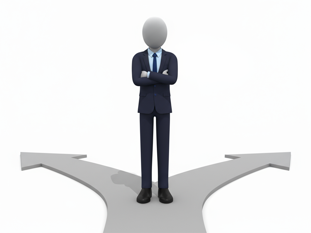スーツを着たビジネスパーソンが、前方の道が左右二手に分かれる分岐点、まさに「岐路」に立ち、腕を組んで進むべき方向を見定めている様子のイラストです。この人物イラストは、キャリアパスの選択、企業の経営方針の決定、新しい市場への進出か否かといった、将来を左右する重要な「決断」の瞬間を象徴的に表現します。ライフプランニングに関するセミナー、転職・就職支援サービスのウェブサイト、経営コンサルティングの資料などで幅広く活用できます。見る人に自身の選択について考えさせる、示唆に富んだ無料イラストです。商用利用可能なフリー素材として、様々なコンテンツでお役立てください。