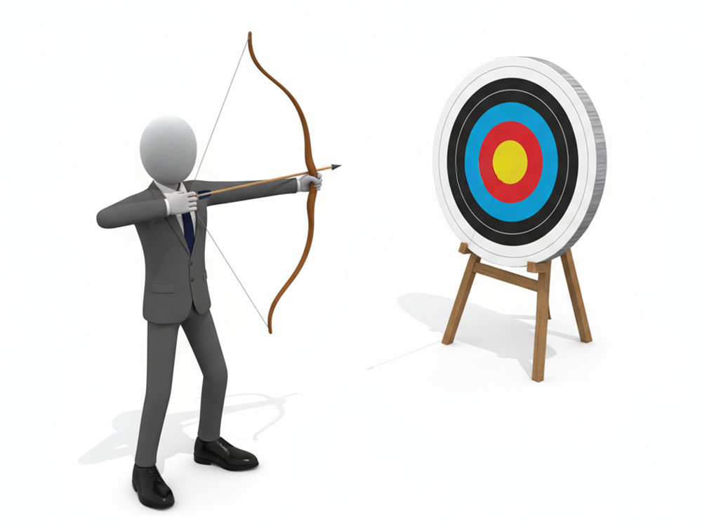 スーツ姿のビジネスパーソンが、アーチェリーのように弓を引きしぼり、前方に置かれた的の中心をじっと見据えて狙いを定めているイラストです。その姿は、高い集中力と達成への強い意志を感じさせます。この人物イラストは、明確な目標設定、ターゲット顧客への的確なアプローチ、精密な事業戦略、そしてゴール達成へのプロセスを象徴します。企業の事業計画書、マーケティング戦略のプレゼンテーション、個人の目標設定に関するコラムなどで幅広く活用できる無料イラストです。商用利用可能なフリー素材として、ビジネスの正確性や計画性をアピールするのに役立ちます。