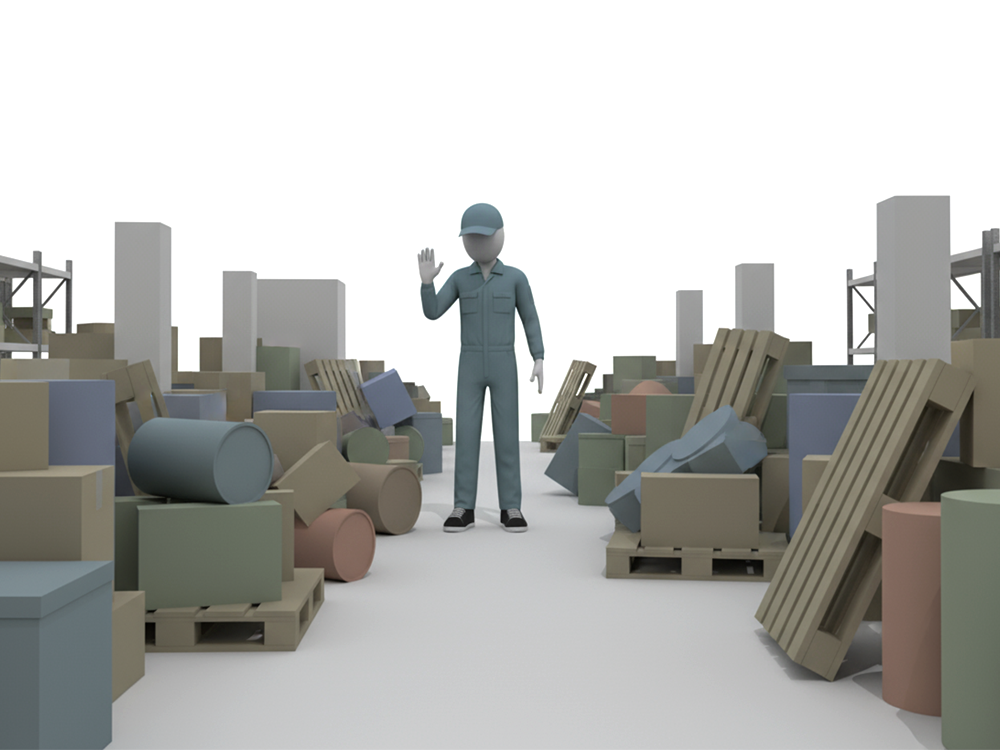 散らかった倉庫でお手上げ状態の作業員イラスト【フリー素材】
