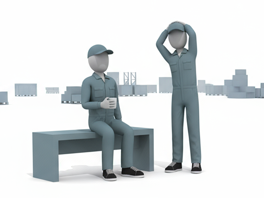 広大な倉庫や工場の敷地を背景に、2人の同僚作業員がベンチに座って休憩している様子を描いた無料イラストです。片方の作業員はマグカップを片手にリラックスし、もう片方は伸びをして体をほぐしています。仕事の合間の大切なリフレッシュタイムや、同僚との何気ないコミュニケーションのひとときを表現しています。このワーキングイラストは、企業の福利厚生の紹介や、働きやすい職場環境をアピールする採用サイトのコンテンツなどに最適なフリー素材です。商用利用もOKです。
