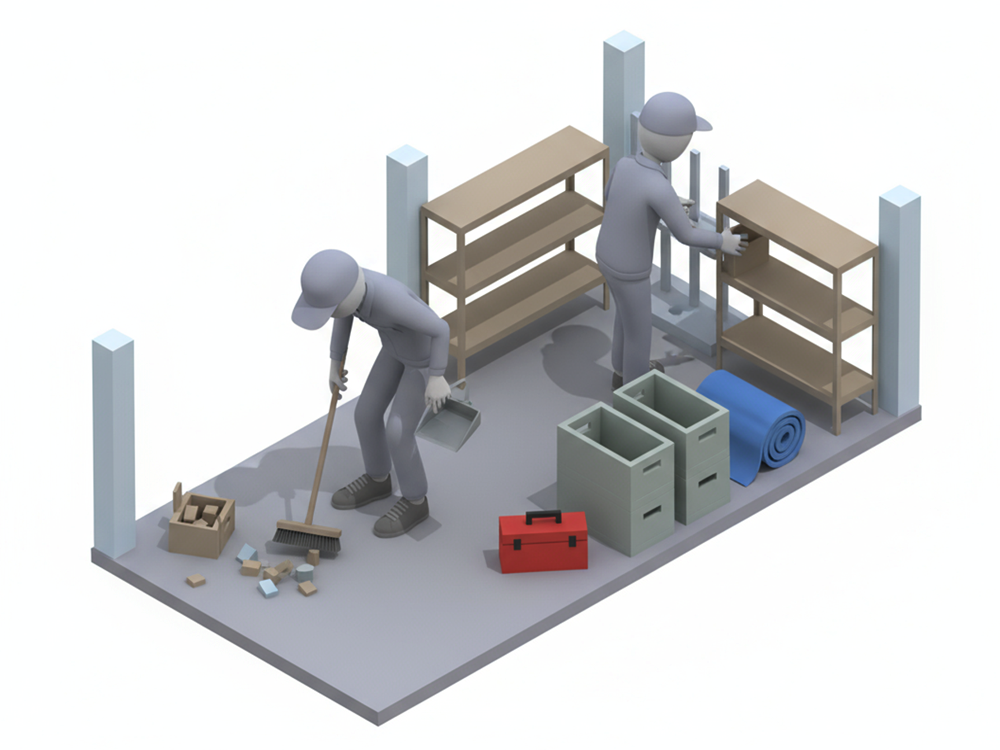 倉庫の清掃・整理整頓をする作業員のイラスト【5Sフリー素材】