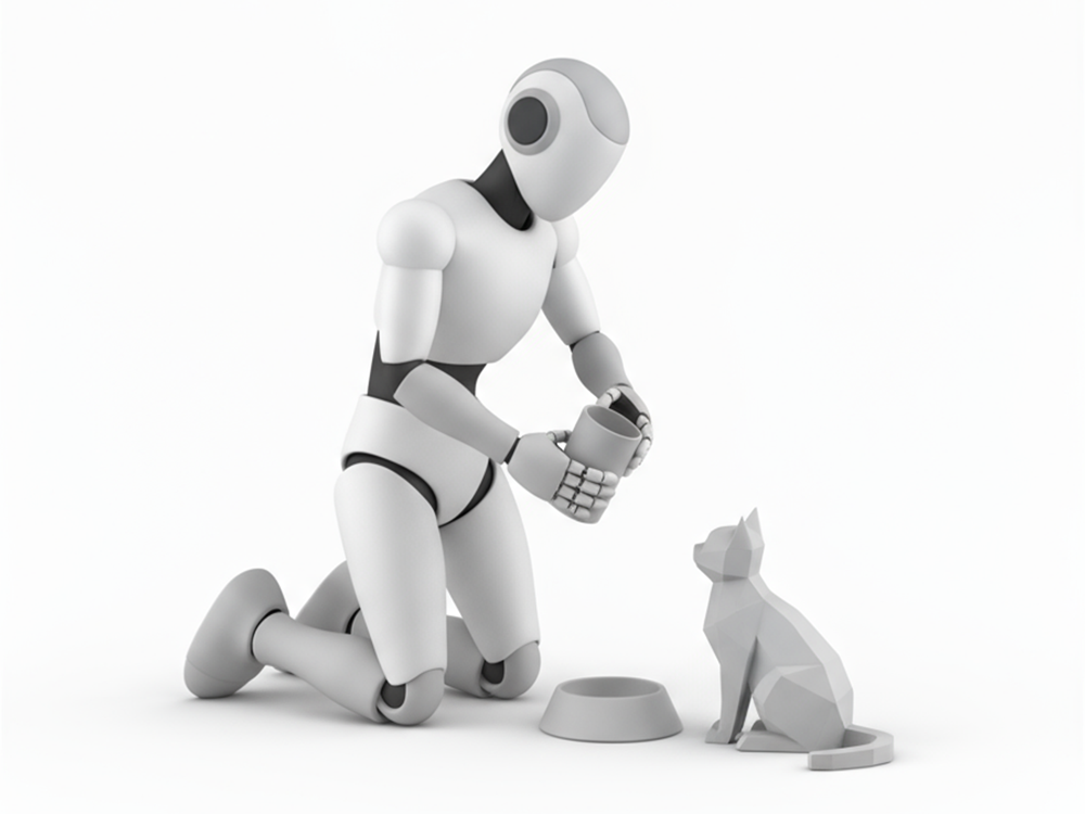しゃがみこんで、小さな猫の餌入れに優しく餌を注ぐヒューマノイドロボットを描いた、高品質な無料イラスト素材です。白を基調としたクリーンなデザインのロボットと、モダンなデザインの猫が、心温まる未来のペットとの共存シーンを表現しています。ロボットの丁寧な手つきからは、ペットへの愛情や思いやりが感じられます。このフリー素材は、テクノロジーと動物の触れ合い、未来のライフスタイル、ペット関連サービスのテーマにぴったりです。商用利用OKなので、企業のウェブサイトやパンフレット、個人のブログ記事の挿絵など、幅広い用途で安心してご活用いただけます。
