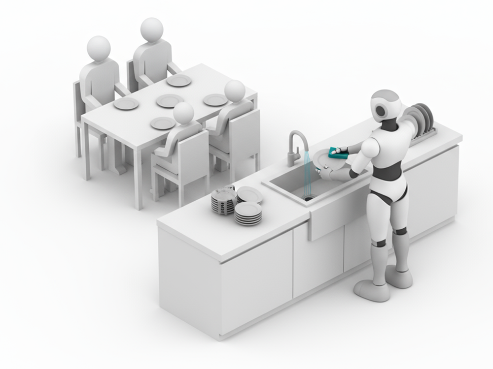 モダンなキッチンで、山積みになったお皿を丁寧に洗うヒューマノイドロボットを描いた無料イラスト素材です。背景には食卓を囲む家族のシルエットが描かれ、ロボットが家庭に溶け込み、家事をサポートしている未来の日常風景を表現しています。このフリー素材は、家事の自動化、スマートホーム、ワークライフバランス、家事代行サービスといったテーマのコンテンツに最適です。商用利用OKですので、企業のサービス紹介ページ、技術系のブログ記事、プレゼンテーション資料など、様々なシーンでご自由にお使いいただけます。