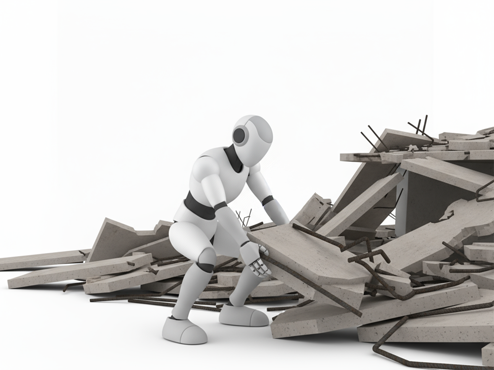 崩れたコンクリートの塊が散乱する災害現場で、人の代わりに危険な瓦礫の撤去作業を行うヒューマノイドロボットを描いた、力強い無料イラスト素材です。困難な状況で人命救助や復旧作業を支える、未来のテクノロジーの活躍を表現しています。このフリー素材は、防災訓練の資料、災害復興に関する報道記事、建設業界の技術紹介、インフラ整備のプレゼンテーションなど、シリアスで専門的なテーマに適しています。商用利用OKですので、企業の技術力アピールや、社会貢献活動の報告書などにもご活用いただけます。
