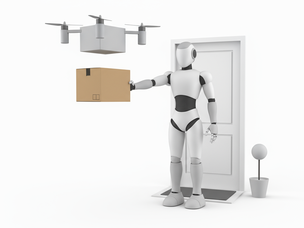 玄関の前で、空中を飛ぶドローンから差し出された段ボール箱を受け取るヒューマノイドロボット。そんな未来の宅配風景を切り取った無料イラスト素材です。「空のドローン」と「陸のロボット」が連携する、次世代の物流システムを分かりやすく表現しています。このフリー素材は、オンラインショッピング、物流業界の技術革新、ドローン活用事例、ラストワンマイル問題など、先進的なテーマのコンテンツに最適です。商用利用OKなので、企業のプレスリリースやサービス紹介資料などにもお使いいただけます。
