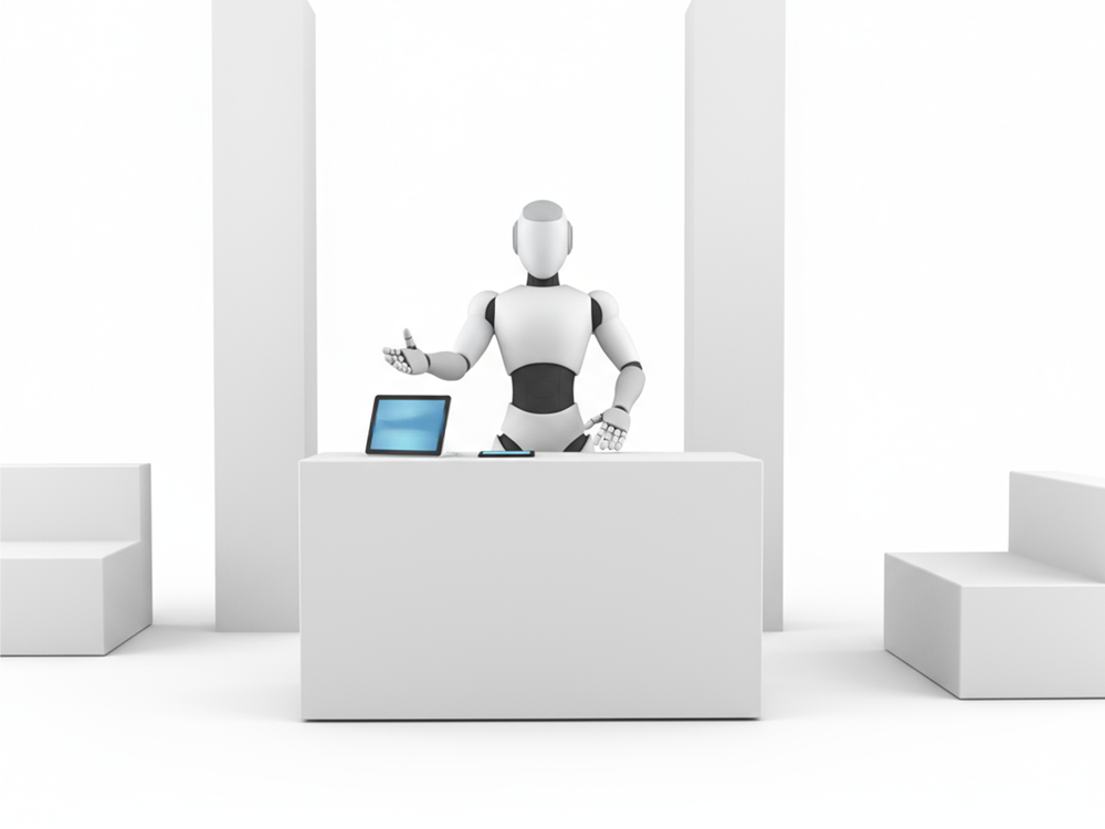 白を基調としたモダンな展示会ブースのカウンターに立ち、来場者に向けて握手を求めるように手を差し出しているヒューマノイドロボットを描いた無料イラスト素材です。カウンターの上にはタブレット端末が置かれ、インタラクティブな製品説明や案内を行う未来のイベントシーンを表現しています。このフリー素材は、企業の製品発表会、合同説明会、商業施設の案内カウンターなど、最先端の接客やプレゼンテーションのイメージに最適です。商用利用OKです。