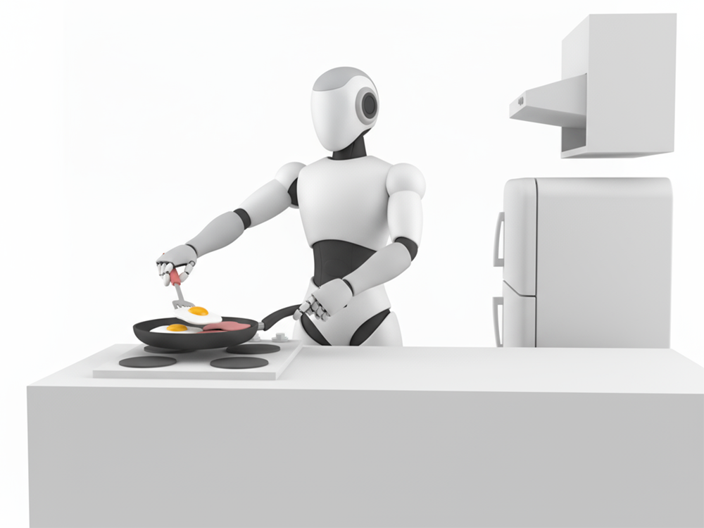 清潔感のある白いキッチンカウンターで、ヒューマノイドロボットがフライパンを片手に持ち、もう片方の手のフライ返しでベーコンエッグを上手に調理している無料イラスト素材です。完璧な火加減と手際の良さを感じさせる姿が、未来の家庭料理の風景を想像させます。このフリー素材は、調理家電メーカー、食品宅配サービス、レストランの自動化、未来の食生活に関するコラムなど、食とテクノロジーをテーマにした様々なコンテンツに最適です。商用利用OKです。