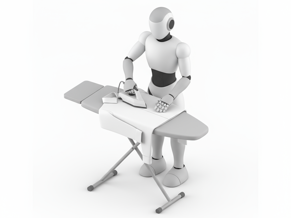 アイロン台に向かい、白いYシャツのシワを丁寧に伸ばしているヒューマノイドロボットを描いた、クリーンな印象の無料イラスト素材です。面倒で時間のかかるアイロンがけを、ロボットが寸分の狂いなく完璧にこなしてくれる、そんな夢のような未来の日常を表現しています。このフリー素材は、家事代行サービス、スマート家電、クリーニング店のウェブサイト、ライフハック系のブログ記事などに最適です。商用利用OKなので、ビジネスシーンでも幅広くご活用いただけます。