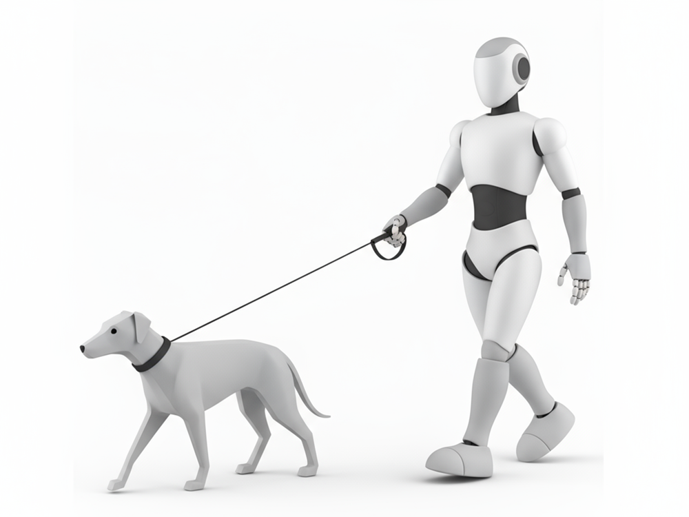 白い犬のリードを手に持ち、歩調を合わせて一緒にウォーキングをしているヒューマノイドロボットの姿を描いた無料イラスト素材です。飼い主が忙しい時や体調が優れない時でも、愛犬の日課である散歩をロボットが安全に代行してくれる、そんな未来の便利なペットライフを表現しています。このフリー素材は、ペットシッターや犬の散歩代行サービスの紹介、ペット関連の最新技術に関する記事などに最適です。商用利用OKなので、安心してご活用ください。