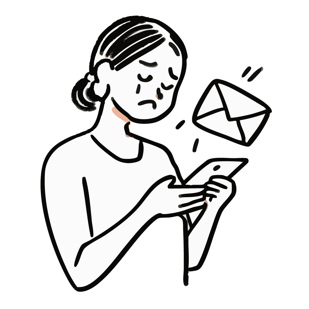 スマートフォンに届いたメール(通知)を見て、涙を流して悲しんでいる女性の無料イラストです。シンプルなモノクロ風のタッチが、より一層悲しさを引き立てます。このフリー素材は、悲しい知らせ、失恋、ネット上でのトラブル、またはメンタルヘルスの不調など、深刻なシーンを表現するのに適しています。商用利用OKですので、ウェブコラム、挿絵、カウンセリング関連の資料など、感情に訴えかけるコンテンツでご活用いただけます。