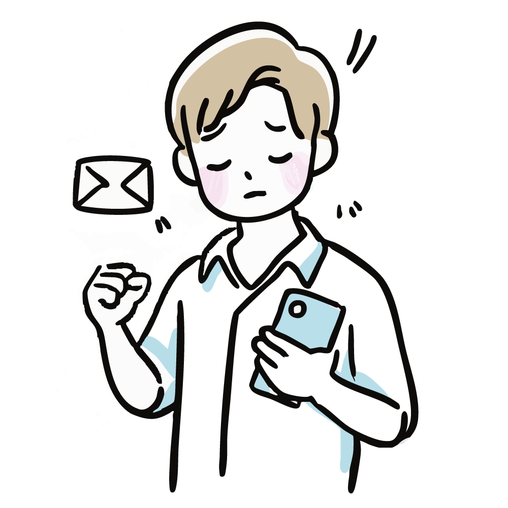 ワイシャツ姿の男性が、スマートフォンを片手に持ち、メールの通知を見てがっかりと落ち込んでいる様子の無料イラストです。仕事でのミス、悪い知らせ、または期待外れの結果に失望している状況が描かれています。このフリー素材は、ビジネスシーンでの失敗、業務上の悩み、またはメンタルヘルス、過労といったテーマに最適です。商用利用OKですので、企業の資料やウェブコラムなどで、ネガティブな状況を分かりやすく示す挿絵としてご活用ください。