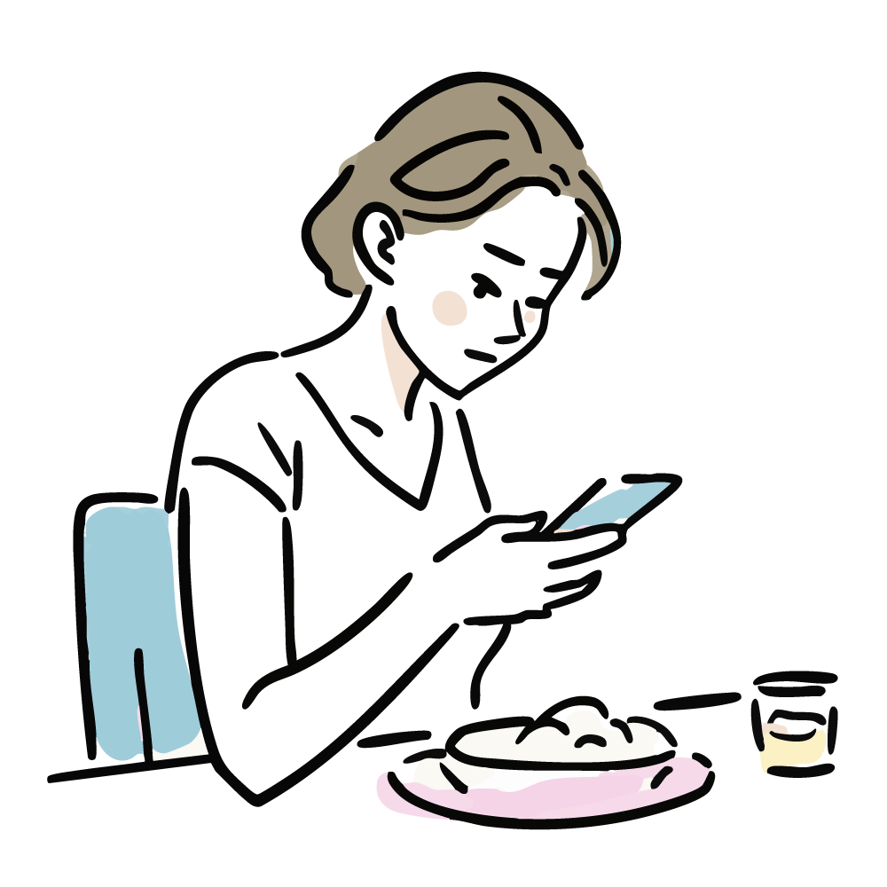 食事中にスマホを見る女性(ながらスマホ)のフリーイラスト素材