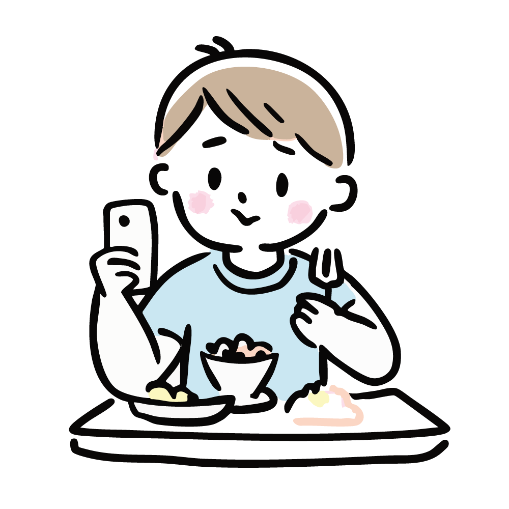食事をしながら、もう片方の手でスマートフォンを持ち、笑顔で画面を見ている男の子(男性)の無料イラストです。楽しい動画や好きなコンテンツを見ながら、食事の時間を楽しんでいる日常のワンシーンが描かれています。このフリー素材は、子供の「ながらスマホ」、楽しい食事風景、またはデジタルデバイスに親しむ現代の子供の様子を表現するのに最適です。商用利用OKですので、子育てブログやライフスタイル系のコラムなどに幅広くご活用いただけます。