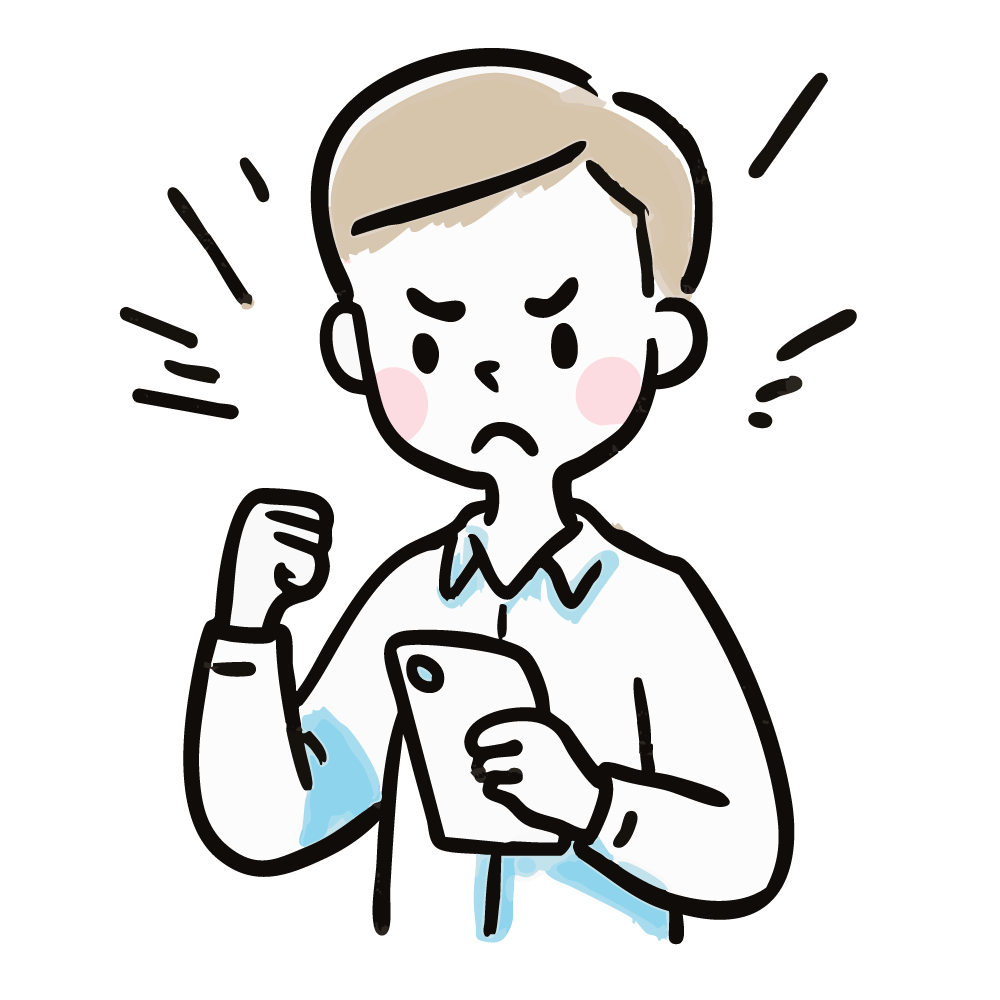 ワイシャツ姿の男性が、スマートフォンを片手に持ち、もう片方の手で拳を固め、怒りを露わにしている無料イラストです。仕事上の予期せぬトラブル、理不尽な要求、またはシステムのエラーなど、ビジネスシーンでの強い不満や怒りが表現されています。このフリー素材は、業務上の問題点、ストレス、クレーム対応などを扱うコンテンツの挿絵として最適です。商用利用OKですので、企業の資料やウェブ記事など、幅広くご利用いただけます。