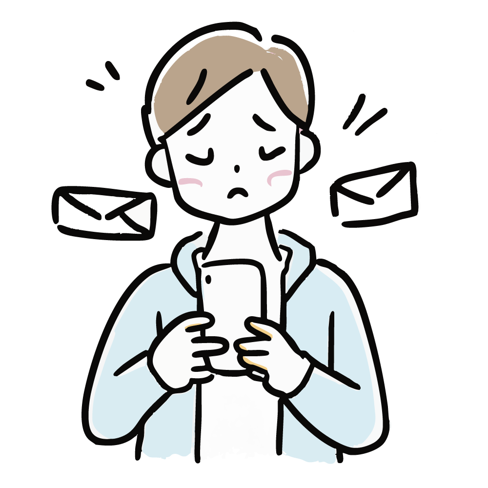 スマートフォンを手に持ち、次々と届くメール(通知)のアイコンを見て、うんざり・落ち込んでいる男性の無料イラストです。情報過多、仕事の多忙さ、またはSNS疲れなど、現代のデジタル社会におけるネガティブな側面が描かれています。このフリー素材は、業務過多、メンタルヘルス、デジタルデトックス、または情報リテラシーといったテーマを扱うコンテンツに最適です。商用利用OKですので、幅広くご活用いただけます。