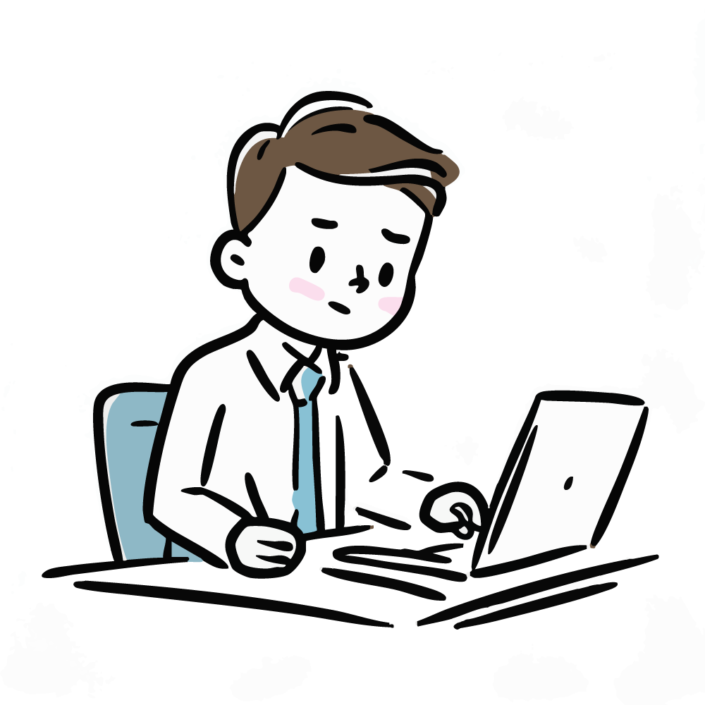 ノートパソコンとペンを手に、デスクで深く考え込むスーツ姿の男性を描いた無料イラスト素材です。神妙な面持ちで、難しい課題や業務トラブルの対応に追われている様子が伝わります。ビジネスシーンでの「悩み」「思考」「問題解決」といったテーマに最適です。働く人物の真剣な表情は、プレゼン資料やウェブサイトのアイキャッチとして、見る人の共感を引き出します。このフリー素材は、企画が難航している様子や、複雑なデータ分析をしている場面など、さまざまなビジネスの状況を表現するのに役立ちます。商用利用OKですので、企業のオウンドメディアや報告書にも安心してご活用ください。