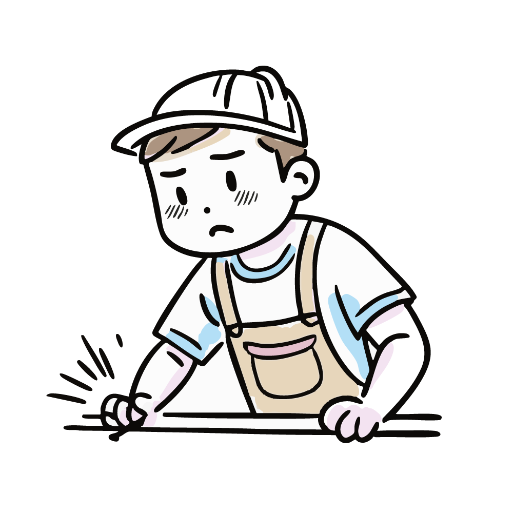 帽子とオーバーオール(作業着)を身につけた男性が、かがみ込んで床や台の表面を熱心に磨いている、あるいは点検している様子を描いた無料イラスト素材です。真剣な眼差しと手の動きから、仕事に対する丁寧さや専門性が伝わってきます。「清掃」「メンテナンス」「品質管理」「職人技」といったテーマに最適なイラストです。働く人物のプロフェッショナルな一面を表現しており、ハウスクリーニング、リフォーム会社、製造業などのウェブサイトやパンフレットの挿絵として活躍します。商用利用OKですので、さまざまなビジネスシーンでご活用ください。