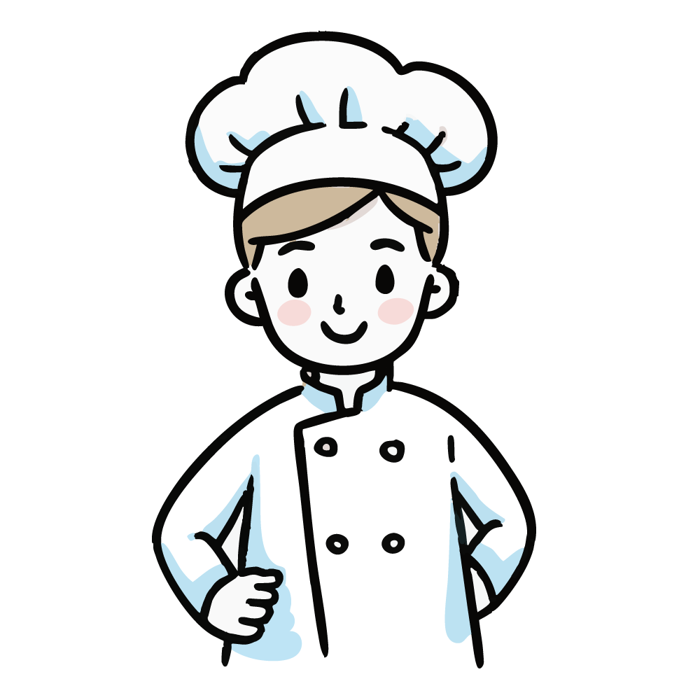 白いコックコートと背の高いコック帽(トック・ブランシュ)を身につけた男性シェフが、片方の腕を腰に当て、自信に満ちた笑顔でこちらを見ている無料イラスト素材です。その姿は、料理への情熱や「食」を提供するプロフェッショナルとしての誇りを感じさせます。働く人物の中でも、特に「飲食店」「レストラン」「パン屋」「パティシE」「料理教室」といった食に関連する業種に最適です。このフリー素材は、飲食店のメニュー、ウェブサイト、求人広告などで、お店の信頼感や明るい雰囲気を伝えるのに役立ちます。商用利用OKです。