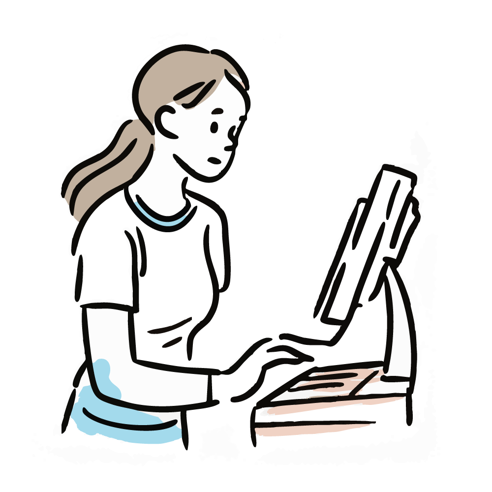 Tシャツ(またはポロシャツ)姿の女性が、デスクトップ型のパソコン(あるいはPOSレジ)の前に立ち、真剣な表情で画面を見つめながらキーボードを操作している無料イラスト素材です。その集中した様子は、データ入力、プログラミング、注文処理など、正確性を求められる作業中の「働く人物」を描写しています。「オフィスワーク」「店舗スタッフ」「事務作業」「集中」といったテーマに最適です。このフリー素材は、業務マニュアル、IT関連のコラム、または求人広告の挿絵として、さまざまなビジネスシーンでご活用いただけます。商用利用OKです。