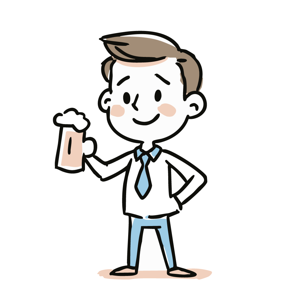 シャツとネクタイ姿のビジネスマンが、泡の立ったビールジョッキを片手に持ち、もう片方の手は腰に当ててリラックスした笑顔を浮かべている無料イラスト素材です。仕事終わりの開放感や、宴会・飲み会での楽しいひとときを表現しています。「乾杯」「お疲れ様の一杯」「懇親会」「ビアガーデン」など、働く人物のリフレッシュタイムを描写するのに最適です。このフリー素材は、飲食店の広告、宴会プランの案内、または「ワークライフバランス」に関するコラムの挿絵として幅広くご活用いただけます。商用利用OKです。