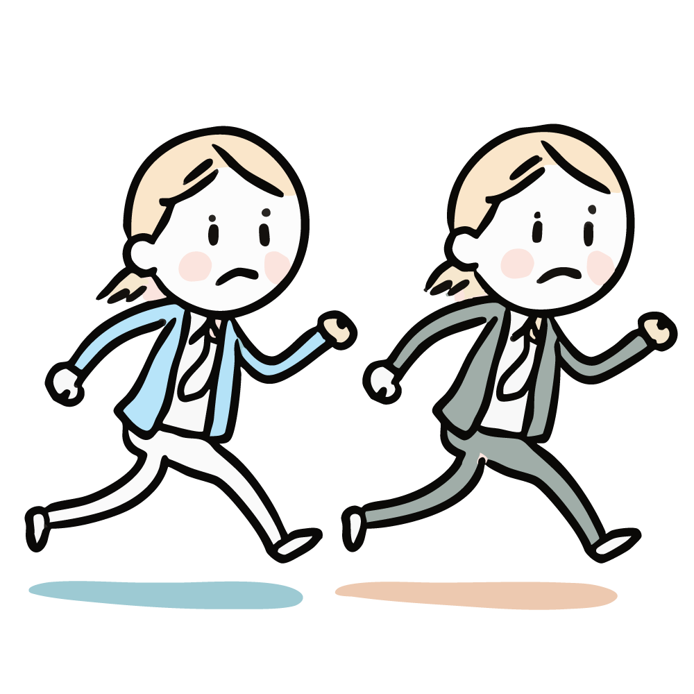 スーツ(パンツスタイル)を着た2人のビジネスウーマンが、深刻な、あるいは焦った表情で、必死に走っている様子の無料イラスト素材です。同じ方向に急ぐ姿は、朝の通勤ラッシュで遅刻しそうな状況や、2人で同じクライアント先へ急行している場面、または社内での緊急事態への対応などを連想させます。働く人物の「急ぐ」「慌てる」「時間に追われる」「競争」といったシーンに最適です。このフリー素材は、時間管理術、業務効率化、または交通遅延に関する情報の挿絵として役立ちます。商用利用OKです。