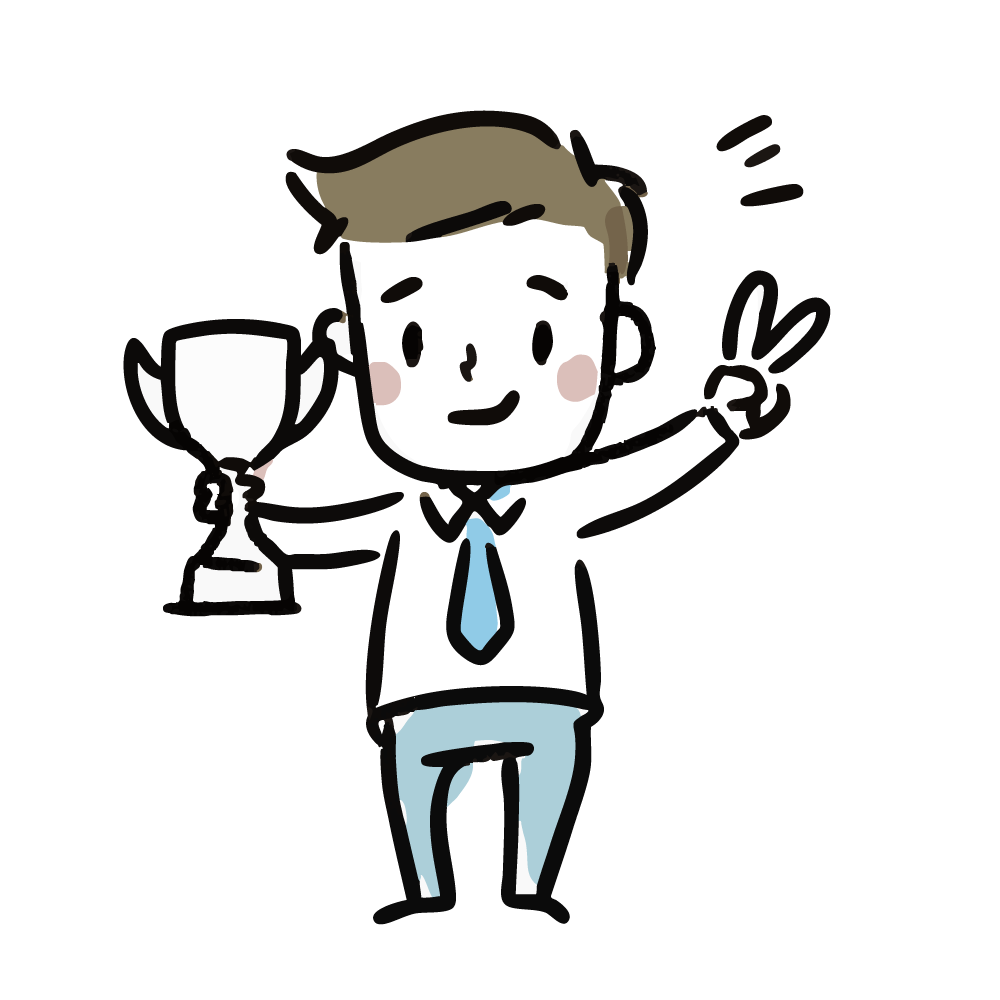 シャツとネクタイという、オフィスでの標準的な服装の男性が、片手にトロフィーを持ち、もう片方の手でピースサインをして喜んでいる無料イラスト素材です。ジャケットを着ていない分、スーツ姿(25)よりもややカジュアルで、身近な「目標達成」や「社内コンテストでの勝利」といった場面を連想させます。働く人物の「達成感」「喜び」「成果」を表現するのに最適です。このフリー素材は、社内報での表彰紹介、営業チームの目標達成報告、または個人のスキルアップ成功事例などで活躍します。商用利用OKです。