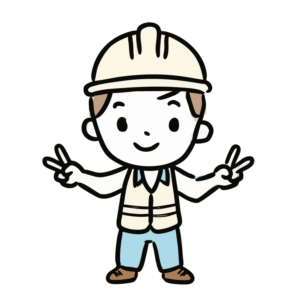 ヘルメットをかぶり、作業ベストを着用した男性作業員が、両手でピースサイン(Vサイン)を作り、満面の笑顔を見せている無料イラスト素材です。その元気でポジティブな姿は、「作業完了」「安全確認OK」「問題なし」といったメッセージを明るく伝えます。働く人物の「元気」「安全」「チームワーク」を象徴するシーンに最適です。このフリー素材は、建設会社や工務店のウェブサイト、安全啓発のポスター、または求人広告(例:「明るく元気な職場です!」)などで、親しみやすさをアピールするのに役立ちます。商用利用OKです。