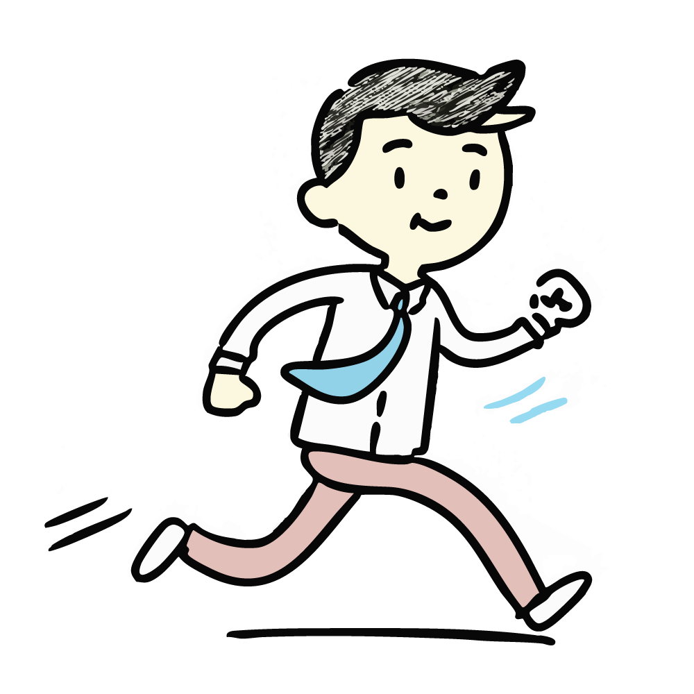 シャツとネクタイ姿のビジネスマンが、元気いっぱいの笑顔で前方に走っている、デフォルメタッチの無料イラスト素材です。その明るい表情と軽快な足取りは、「やる気」「ポジティブなスタート」「前向きな姿勢」を象徴しています。働く人物の「活力」や「成長」をテーマにしたコンテンツに最適です。このフリー素材は、新規プロジェクトのキックオフ、新入社員の紹介、または自己啓発に関するブログ記事のアイキャッチとして、見る人に元気と親しみやすさを与えます。商用利用OKですので、幅広くご活用ください。