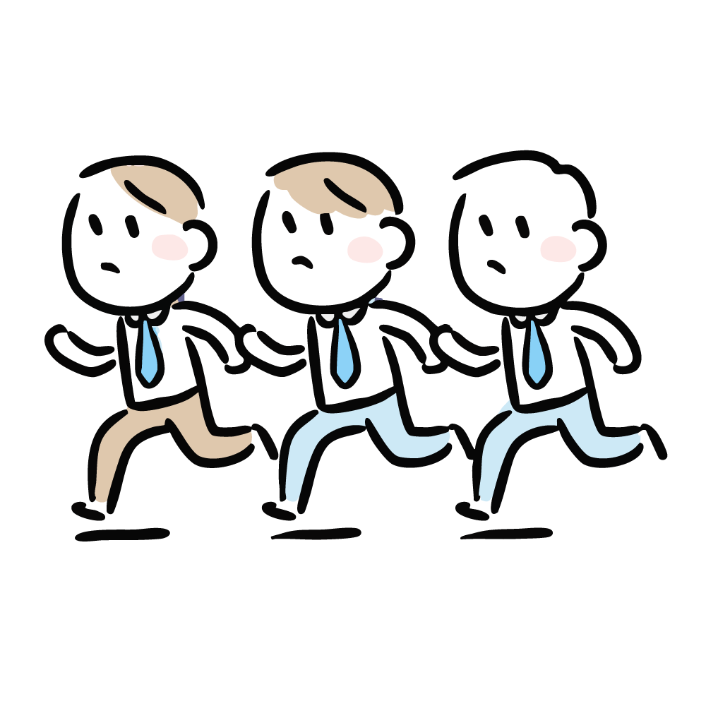 シャツとネクタイ姿の、デフォルメされた可愛いビジネスマン3人が、同じ方向に向かって真剣な(焦った)表情で走っている無料イラスト素材です。チーム全員で緊急事態に対応している様子や、非常に多忙なプロジェクトに追われている状況を連想させます。「緊急対応」「チームでの奮闘」「多忙」「納期切迫」といった、働く人物たちの切迫したシーンに最適です。このフリー素材は、業務効率化ツールの導入事例、プロジェクト管理、または「忙しすぎる職場」の問題提起などのコンテンツで役立ちます。商用利用OKです。