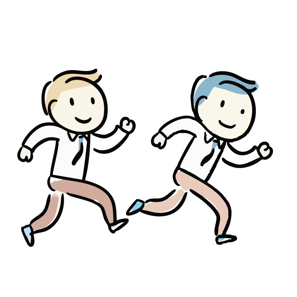 シャツとネクタイ姿の、デフォルメされた可愛い男性ビジネスマン2人が、楽しそうな笑顔で並んで走っている無料イラスト素材です。2人で同じ目標に向かって進む姿は、「チームワーク」「良好な関係の同僚」「切磋琢磨する仲間」といった、働く人物たちのポジティブな関係性を象徴しています。「活気ある職場」「プロジェクトの順調な進行」といったテーマのコンテンツに最適です。このフリー素材は、企業の採用ページや社内報などで、明るく風通しの良い社風を伝える挿絵として役立ちます。商用利用OKです。