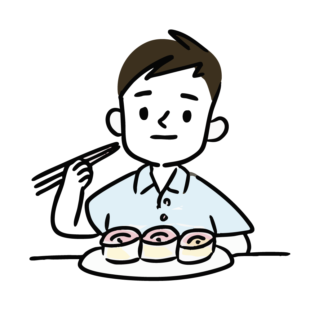 箸を使って巻き寿司を食べようとしている男性の無料イラストです。手描き風のシンプルなタッチで、人物の上半身が描かれています。和食、特に寿司をテーマにしたコンテンツに最適です。このフリー素材は、飲食店のメニューやWebサイト、グルメブログの記事、日本の食文化に関する資料など、さまざまな用途で商用利用OKです。親しみやすいデザインで、食事の楽しさを伝えます。