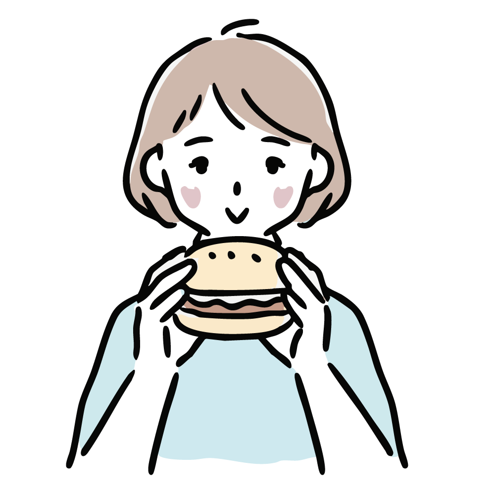 笑顔の女性がハンバーガーを両手で持って食べようとしている、手描き風の無料イラストです。人物の顔が正面から描かれ、食事の楽しさが伝わるデザインです。ファストフード、ランチ、軽食、グルメなどのテーマに最適。このフリー素材は商用利用OKで、飲食店のメニューやWebサイト、ブログのアイキャッチ、SNS投稿など、幅広くご活用いただけます。