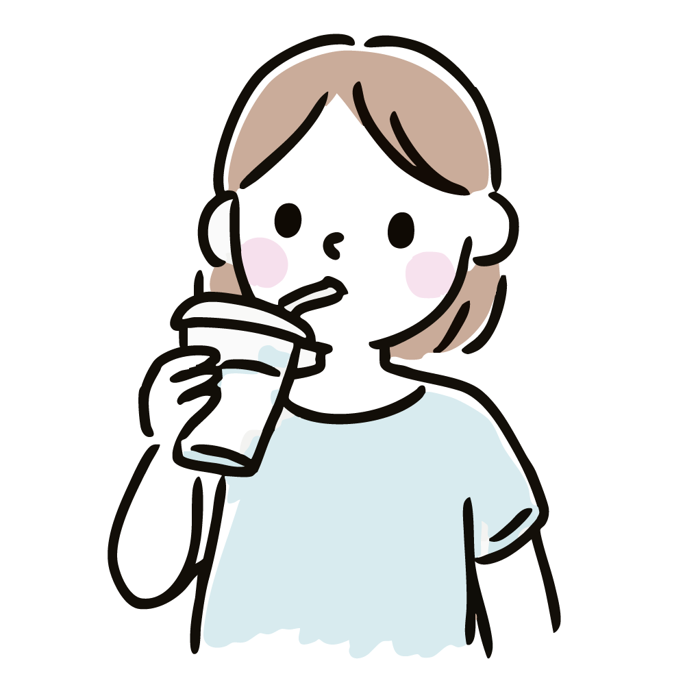 プラスチックカップ(またはタンブラー)に入った飲み物を、ストローを使って飲んでいる女性(女の子)の無料イラストです。人物の上半身が手描き風のシンプルなタッチで描かれています。カフェでの休憩、水分補給、飲料、食事(軽食)などのテーマに最適です。このフリー素材は商用利用OKで、Webサイトの挿絵、ブログ記事、SNS投稿、チラシのデザインなど、さまざまな場面でご活用いただけます。
