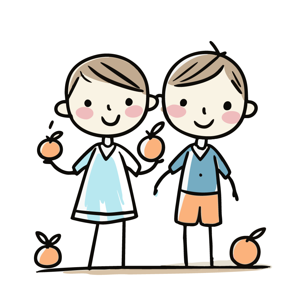 棒人間風のシンプルなデザインで描かれた、男の子と女の子の無料イラストです。二人は笑顔で立っており、周りにはみかん(オレンジ)が転がっています。子供、友情、果物、おやつ、育児などのテーマにぴったりの可愛いデザインです。このフリー素材は商用利用OKで、保育園のお便り、子供向けWebサイト、ブログ記事の挿絵など、温かみのあるコンテンツに最適です。