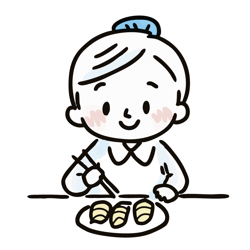 お団子ヘアの女性が、お皿に乗った寿司(いなり寿司や巻き寿司)を箸でつまみ、笑顔で食べようとしている無料イラストです。人物の上半身が手描き風の優しいタッチで描かれています。和食、日本食、寿司、食事、グルメなどのテーマに最適です。このフリー素材は商用利用OKで、飲食店のWebサイトやメニュー、グルメブログ、日本文化を紹介するコンテンツなどに幅広くご活用いただけます。
